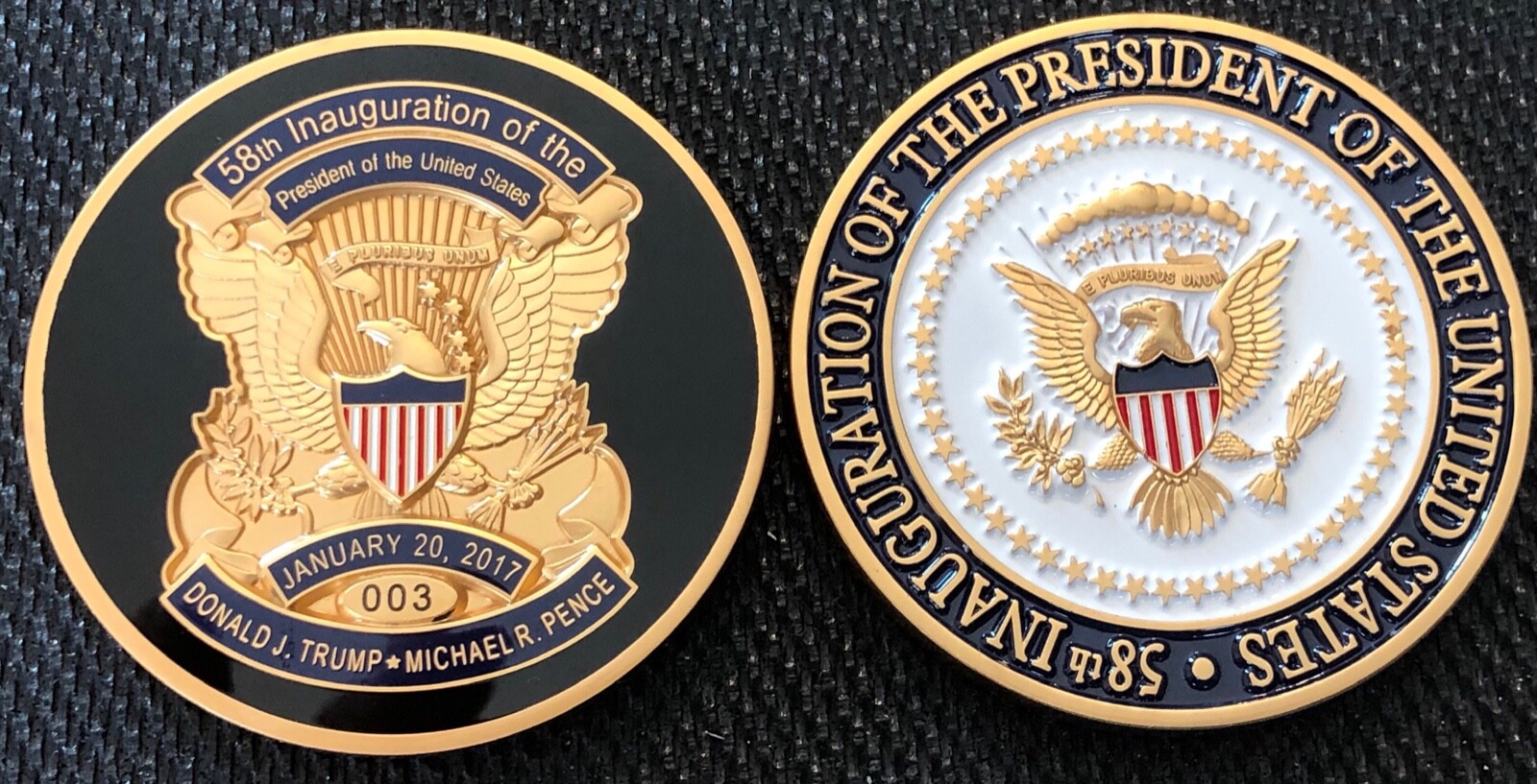 Up for BUY IT NOW format purchase.ONE Donald J. Trump/Michael R. Pence 2017 58th Presidential Inauguration Satin Gold version 1.75in challenge coin. Almost 5 years old and in 2021, almost impossible to find!This is one of the VERY LAST of these VERY RARE coins not already in a personal collection. The coin pictured is not the actual coin you will receive, I didn’t take a photo of the additional coin I relisted. This coin is guaranteed authentic and was manufactured with official authority of the agency listed.